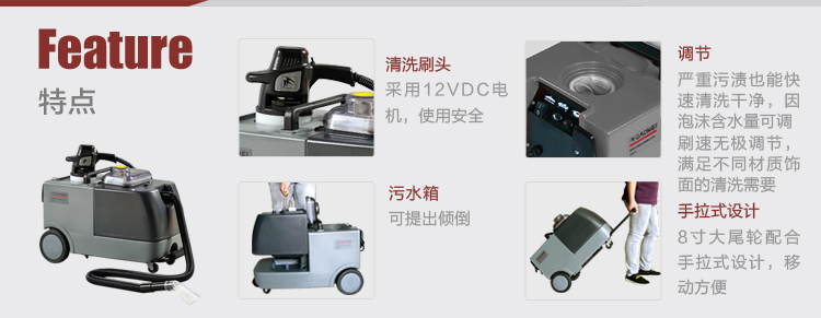 泡沫制造,電動刷洗、真空抽吸三合一,是清洗各種布藝家具和裝飾的專業(yè)設備。適用賓館酒店等場所。